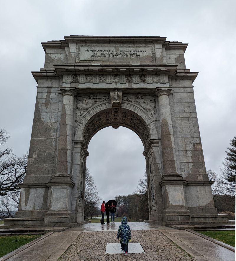 1777 年 12 月 19 日-1778 年 6 月 19 日,华盛顿的大陆军刚被英军击败,撤出费城。约一万两千名士兵进驻(encampment,对,就是最近美国高校学生抗议活动的那个词)郊外的福吉谷,使得福吉谷成为当时十三个殖民地的第四大“城市”。福吉谷被选是由于三个原因:1.离英军距离 18 英里,不太近,所以对方无法偷袭,也不太远,便于阻挡他们进入宾州腹地(当时国会已经迁到约克 York);2.此地两面临河,并且有山(名字很有趣,Mount Misery and Mount Joy,苦难山和欢乐山,因为宾夕法尼亚州建立者威廉・佩恩在一座山迷路了,然后在另一座山又找到了方向),地形易守难攻。这半年福吉谷并未发生战斗,但大陆军要面对低温,疾病(近两千人死亡1),以及缺衣少食。这个刮风下雨春寒料峭的天气,让我稍稍体会到了当年士兵们在这里的困难的万分之一。五月,美国与法国结盟,英军撤出费城,回防纽约,六月,华盛顿率军离开福吉谷。